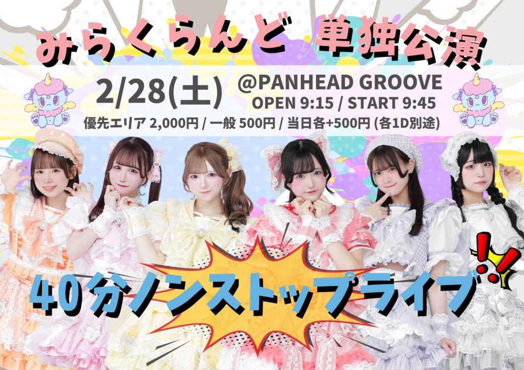 「 2026年2月 」 一覧 2026.02.28(SAT) 『みらくらんど 単独公演-40分ノンストップライブ‼️-』📍PANHEAD GROOVEOPEN 9:15 / START 9:45優先エリア 2000円 / 一般 500円(入場時1ドリンク600yen別途要) 🔗https://tiget.net/events/469809 2026.02.28(SAT) 2026.02.28(SAT) LIVE SHOWER 2026OPEN 16:30 / START 17:00adv 2000yen / door 2500yen(入場時2ドリンク1200yen別途要)Assortment of My PastimesアメニモマケズSTAY-WANDERただ君に雨KiteBlack Cross « 前へ 1 2